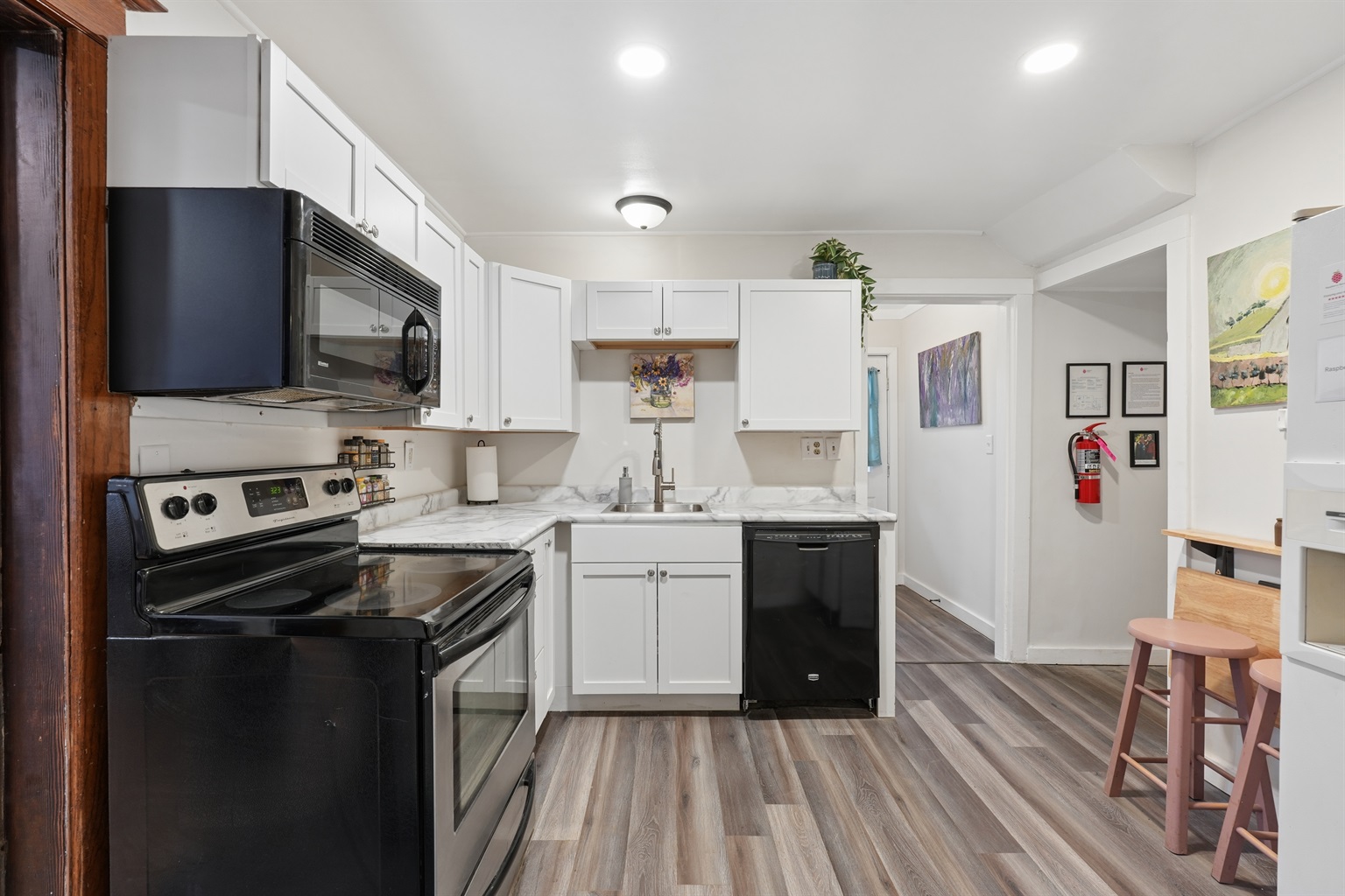 Outside on the front porch you can watch trains pass by and neighbors walking their dogs behind a tiny city park, or enjoy the large back deck with dining area overlooking the spacious backyard with fire pit. Free street parking is available directly in front of the home, with additional parking available in the alley behind the property. Public transportation is plentiful and just steps away.