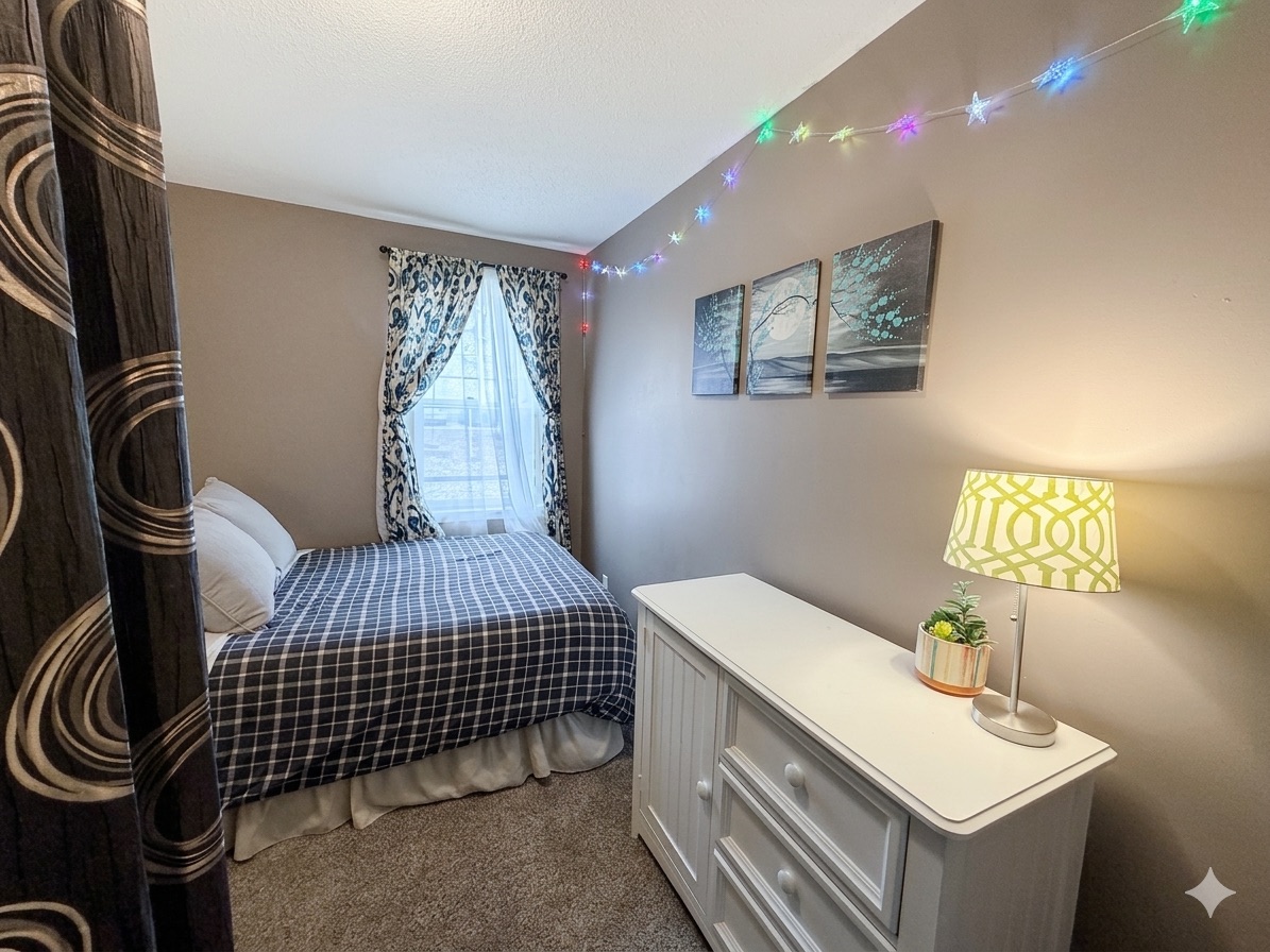 Inside, the home is designed for comfort and ease. There are two bedrooms, one with a full bed and the other soon to be a queen (though our photos still show a twin), along with a spacious living area and a fully stocked kitchen ready for everything from quick breakfasts to shared meals. The home comfortably sleeps four guests, with the option to accommodate up to six using our optional airbed kit available for your stay.